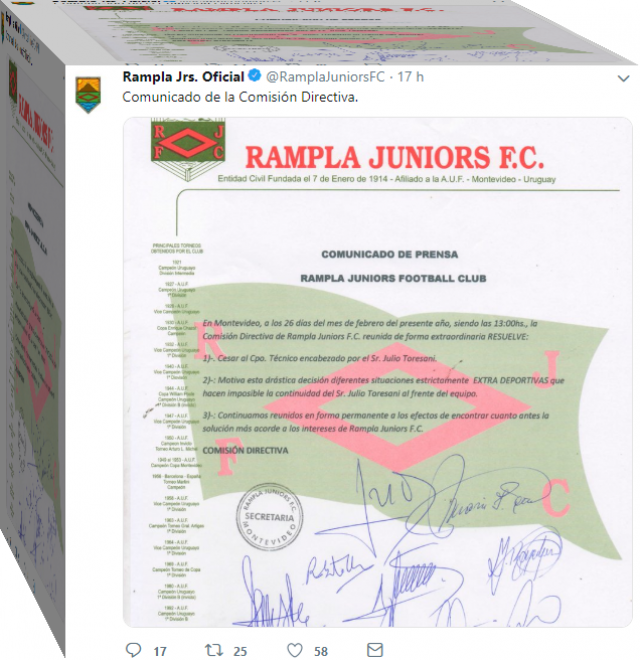 — Rampla Jrs. Oficial (@RamplaJuniorsFC) 26 de febrero de 2019