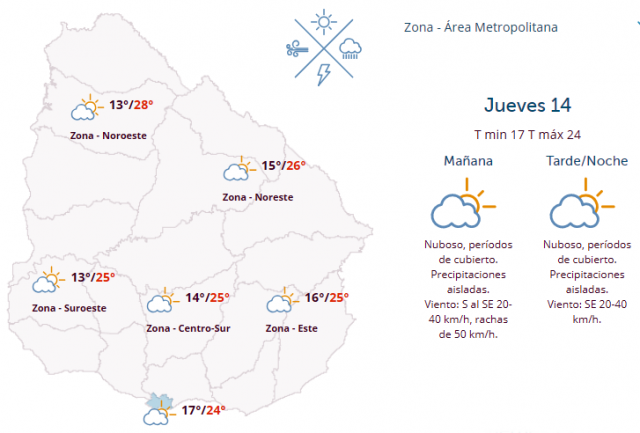 En tanto para la zona Norte del país, el Inumet anuncia tiempo fresco a cálido con cielo algo nuboso, períodos de claro.