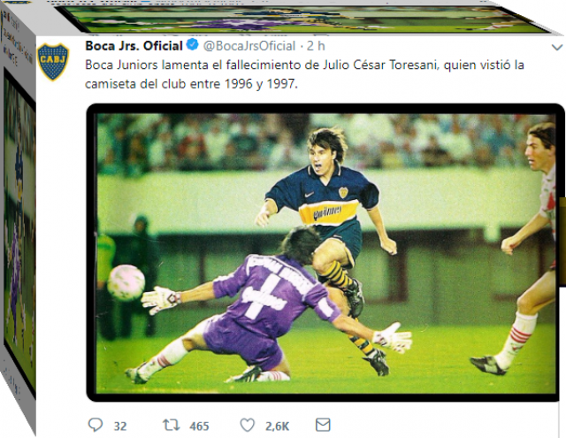 "Boca Juniors lamenta el fallecimiento de Julio César Toresani, quien vistió la camiseta del club entre 1996 y 1997", escribió el club en su cuenta de la red social Twitter.