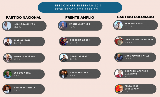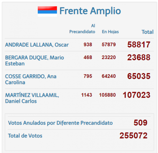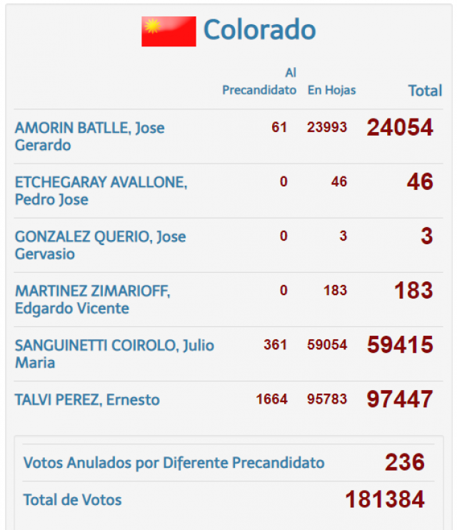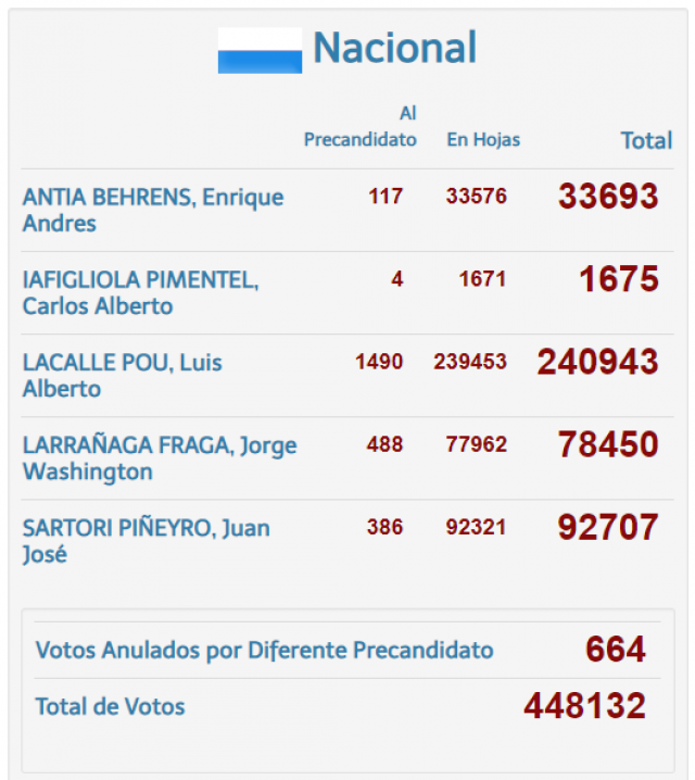 Acceda al detalle de la cantidad de votos por partido, según los últimos datos difundidos por la Corte Electoral, en base al escrutinio primario realizado en las últimas horas.