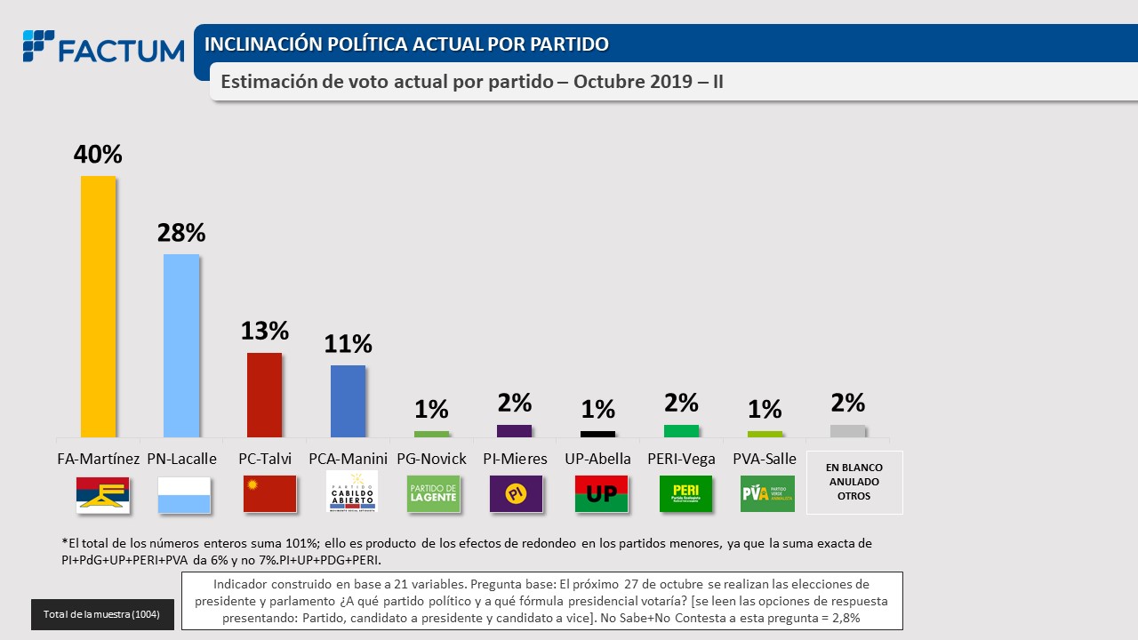 La estimación actual por partido, muestra un escenario con el FA en el entorno del 40% (37%-43%), el PN alrededor del 28% (25%-31%), el Partido Colorado cercano al 13% (11%-15%) y Cabildo Abierto al 11% (11%-13%).