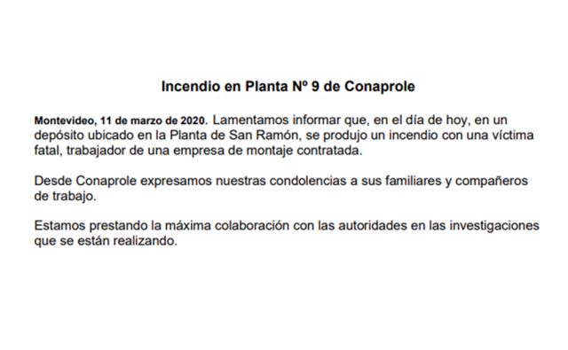 11/Mar/2020 Manuel Garcial Sentido pésame a sus deudos y felicitaciones so Sindicato de Conaprole. Tengo entendido que el trabajador fallecido hace escaso tiempo había perdido a su esposa lo que me hace dudar de la existencia de un dios protector.