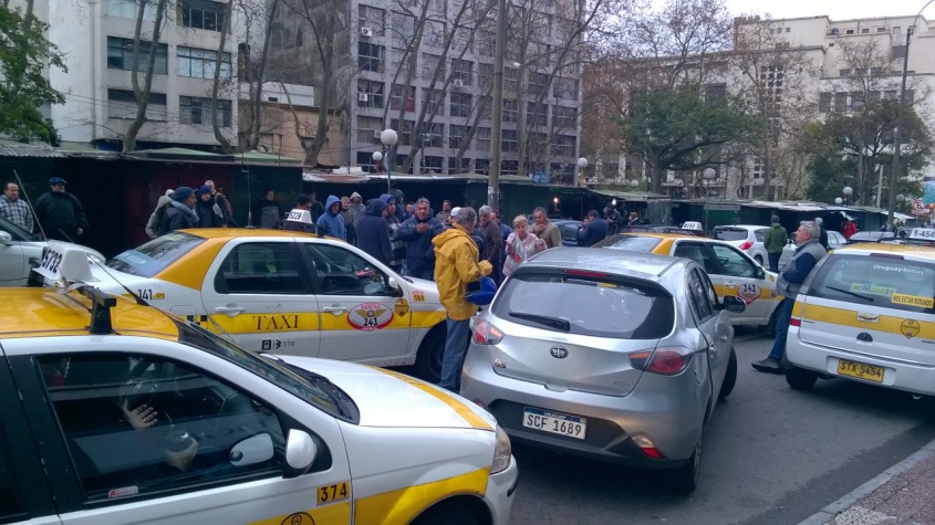 En pleno Barrio Cordón, al frente de la Dirección General Impositiva el clima se puso tenso cuando en este mediodia el chofer de UBER fue bloqueado por los taxistas que llegaron al lugar.