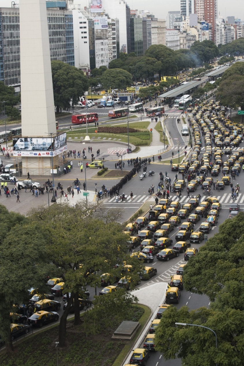 En medio del gigantesco atasco de tránsito, cientos de taxistas se movilizaron al grito de 'Fuera Uber de Argentina', en la mayor de las protestas que realizaron contra Uber desde que comenzó a operar en el país.