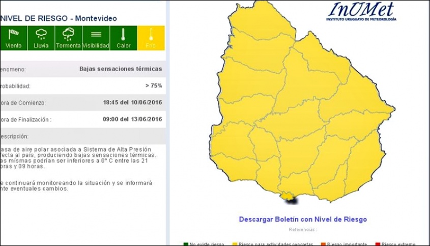 Una masa de aire polar asociada a un sistema de alta presión afecta al país,produciendo bajas sensaciones térmicas. Las mísmas podrían ser inferiores a 0º C entre las 21 horas y 09 horas