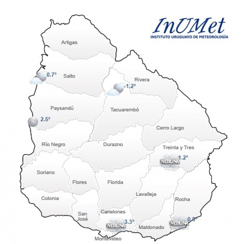 Según el Instituto Uruguayo de Meteorología, en Montevideo y el Área Metropolitana, este se presentará frío a fresco con cielo claro y algo nuboso a nuboso. Neblinas. Bajas sensaciones térmicas. Heladas agrometeorológicas. La máxima anunciada es de 15º C y la mínima 2º C.