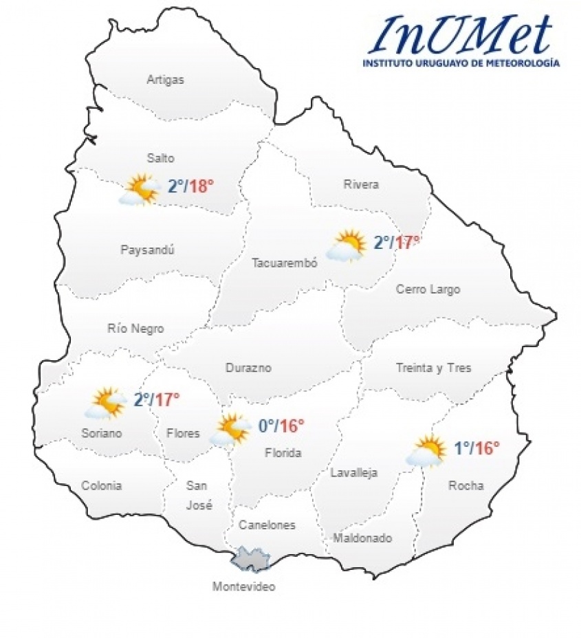 Según el Instituto Uruguayo de Meteorología, en Montevideo y el Área Metropolitana, este miércoles se presentará frío a fresco con cielo claro y algo nuboso a nuboso. Neblinas y bancos de niebla. La máxima anunciada es de 15º C y la mínima 5ºC.