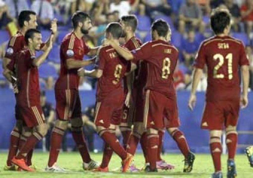 España: David de Gea; Juanfran, Gerard Pique, Sergio Ramos (cap), Jordi Alba; Cesc Fabregas, Sergio Busquets, Andres Iniesta; David Silva, Alvaro Morata, Nolito. DT: Vicente del Bosque.