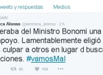 En la red social de Twitter, Alonso escribió que "esperaba del ministro Bonomi una actitud de apoyo. Lamentablemente eligió una vez más culpar a otros en lugar de buscar soluciones. #vamosMal".