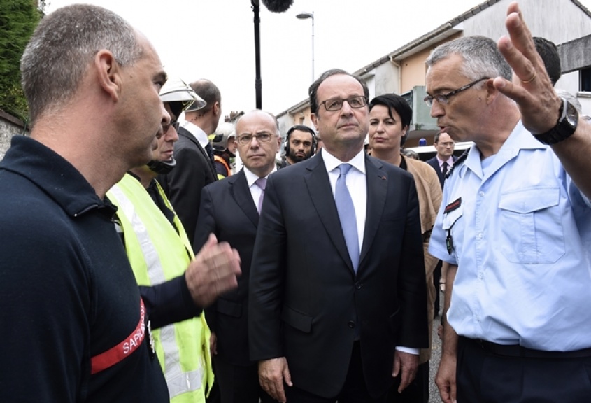 El presidente francés François Hollande condenó un "vil atentado terrorista" cometido por "dos terroristas que dijeron ser de Dáesh", el acrónimo en árabe del Estado Islámico, al llegar a la iglesia de Saint-Etienne-du-Rouvray (norte), donde un sacerdote fue degollado.