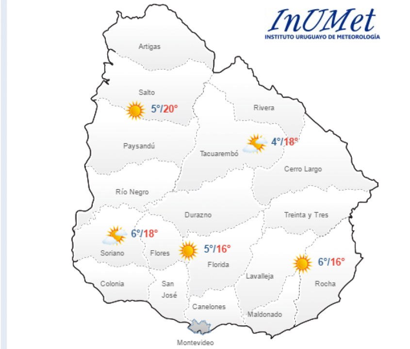 Según el Instituto Uruguayo de Meteorología, en Montevideo y el Área Metropolitana, este se presentará frío a fresco con cielo algo nuboso a nuboso. La máxima anunciada es de 14 º C y la mínima 6º C.