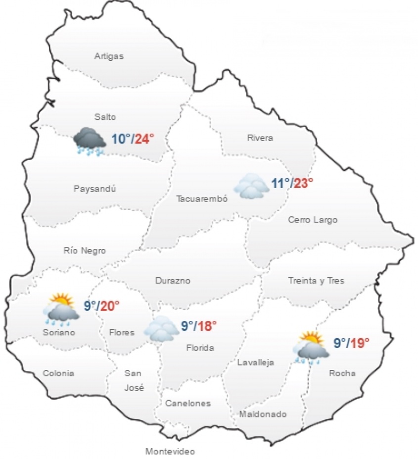 Para Montevideo y Área Metropolitana se prevé tiempo frío a fresco con cielo nuboso, periodos de cubierto. Precipitaciones y tormentas aisladas, mejorando.
