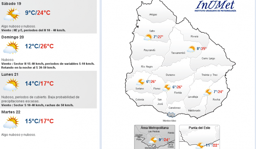 Viento : Sector N 15-40 km/h, periodos de variables 5-10 km/h. Rotando en la noche al S 30-50 km/h.
