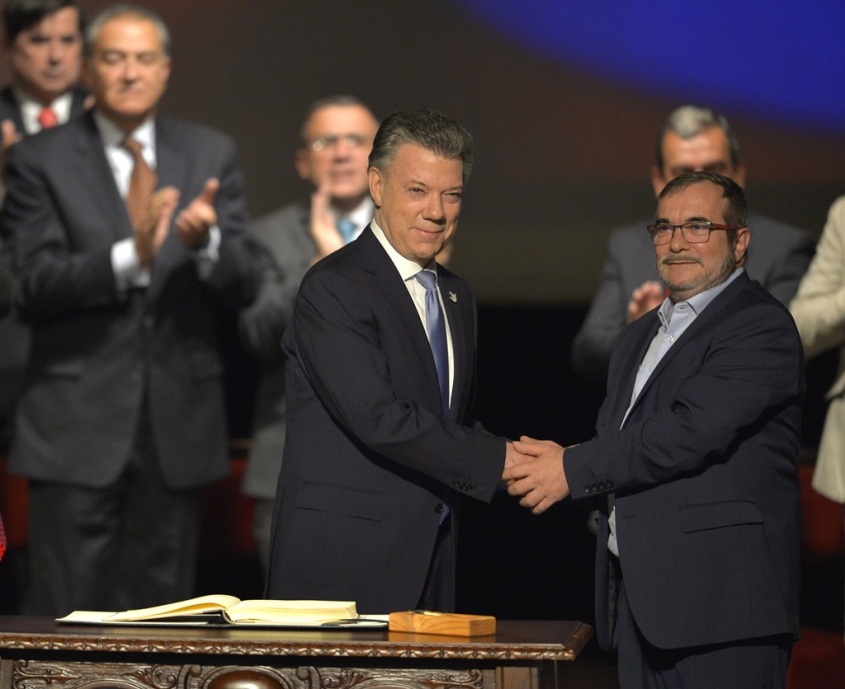 Casi dos meses después de que los colombianos rechazaran el acuerdo de paz en un plebiscito, el presidente Juan Manuel Santos y el líder de las marxistas Fuerzas Armadas Revolucionarias de Colombia (FARC), Rodrigo Londoño (Timochenko), sellaron con un "balígrafo" (una bala convertida en bolígrafo) el revisado pacto, en una austera ceremonia.