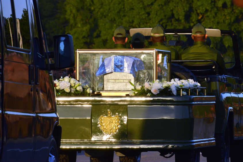 La urna de cedro con las cenizas, cubierta por una bandera cubana, protegida por una campana de cristal y colocada en un armón militar con flores blancas, partió a las 07H16 (12H16 GMT) desde el Ministerio de las Fuerzas Armadas, en la Plaza de la Revolución.