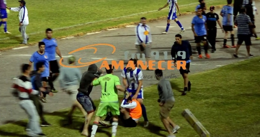 Los incidentes se agudizaron al finalizar el mismo y se registraron golpes de puño, patadas y según los testigos, hasta una silla fue lanzada desde la cancha hacia a la tribuna y desde la grada se lanzó un termo a los jugadores.