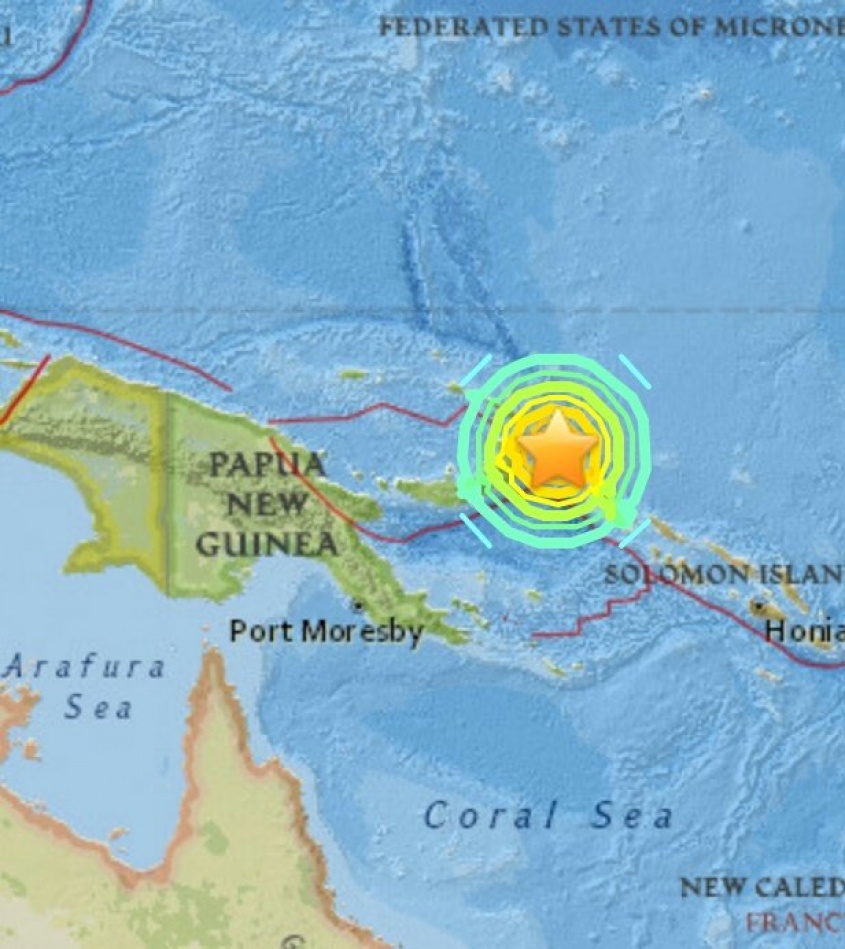 El temblor se produjo a las 10H51 GMT en el mar, a 60 kilómetros al este de Taron, una localidad de la isla de Nueva Irlanda, a 75 kilómetros de profundidad. Su magnitud, que en un primer momento se evaluó en 8, fue poco después revisada en 7,9 por el Instituto de Estudios Geológicos de Estados Unidos (USGS).