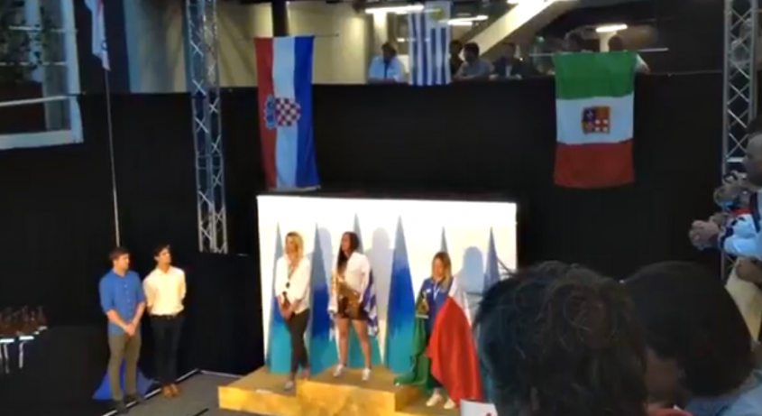 Al otro lado del planeta, abrazada a la bandera, la campeona del mundo entona el himno nacional
