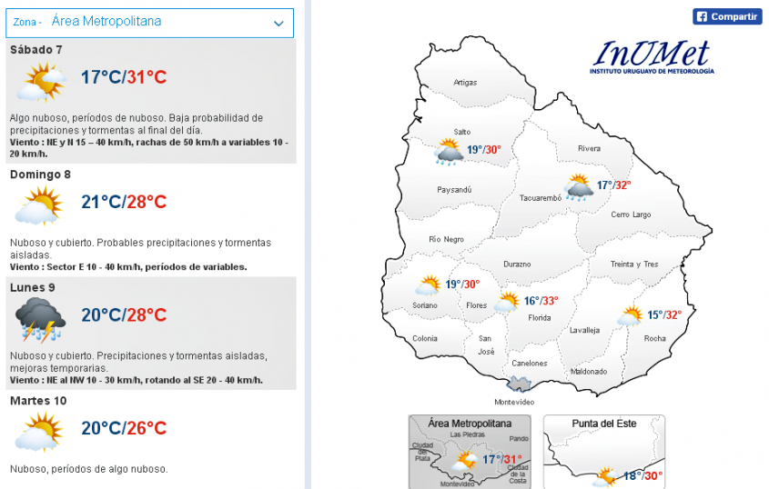 Algo nuboso, períodos de nuboso. Baja probabilidad de precipitaciones y tormentas al final del día.