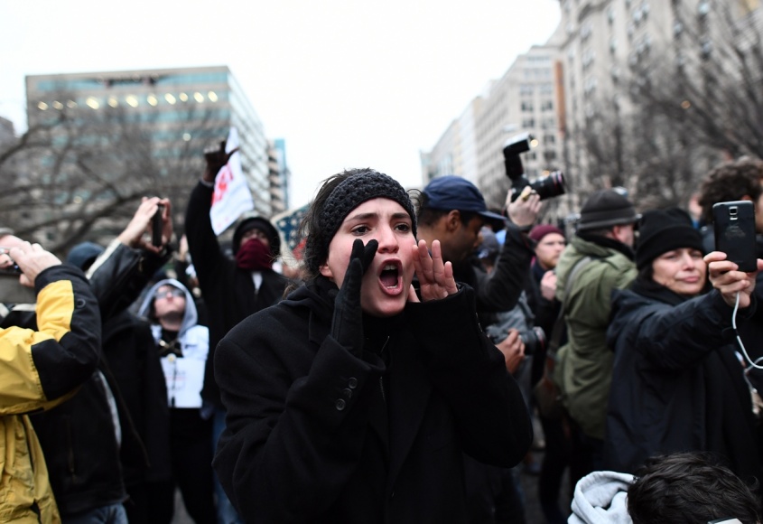 "Cuatro años de lucha", leía la pancarta de una manifestante enmascarada, en referencia al mandato del magnate inmobiliario Donald Trump, que se convirtió unas horas antes en el 45° presidente de Estados Unidos.