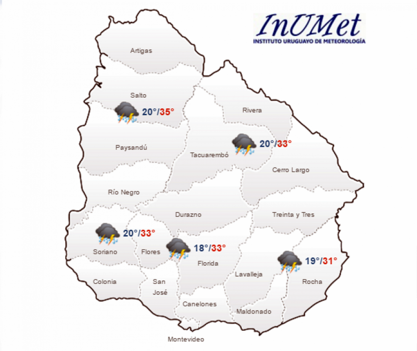 En tanto para la zona Norte del país Inumet pronostica tiempo templado a caluroso con aumento de nubosidad. Desmejorando con precipitaciones y tormentas aisladas desde la tarde.