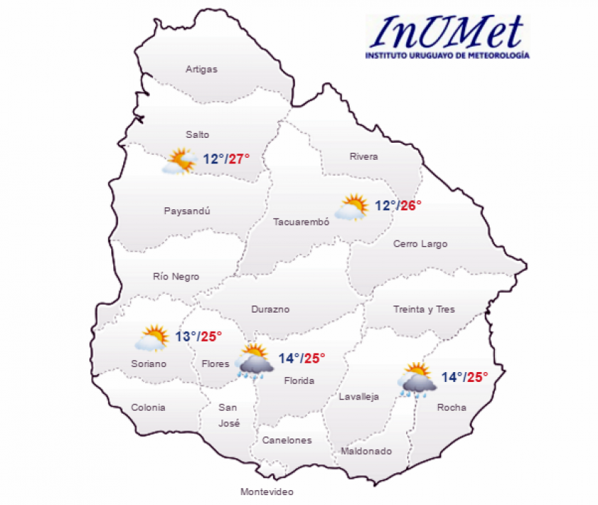 En tanto para la zona Norte del país el Inumet anuncia tiempo fresco a cálido con cielo algo nuboso, períodos de nuboso.