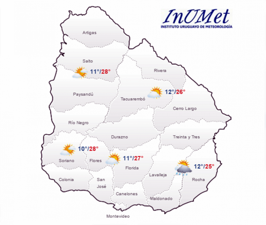 En tanto para la zona Norte del país, el Inumet pronostica tiempo fresco a cálido con cielo algo nuboso, períodos de nuboso.