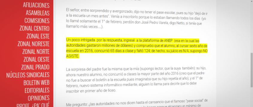Benoit ingresó a la plataforma de ANEP donde constató, según su relato, que el alumno al cursar sexto año de escuela en 2016, concurrió 65 días a clase y faltó 124; siendo su juicio N/A.