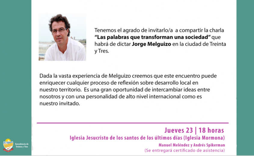 Melguizo llegará a Treinta y Tres el miércoles 22 de febrero y realizará una recorrida por el departamento. El jueves 23 lo dedicará a mantener reuniones con autoridades nacionales del Ministerio del Interior y de la Intendencia de Treinta y Tres, ofreciendo una charla destinada básicamente a funcionarios del Ministerio del Interior y de la Intendencia, sobre el tema “De todo laberinto se sale por arriba. Aprendizajes de Medellín en seguridad y convivencia”.
