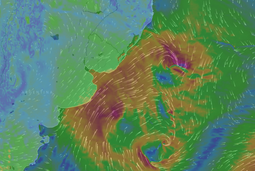 Entre domingo y lunes el organismo observa la presencia de una vaguada en altura ( masas de aire cálido y húmedo) propiciando el desarrollo de un ciclón en superficie al sur de Uruguay entre 40 y 45ºS.