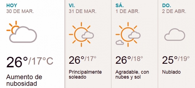 Las temperaturas extremas previstas, mínima 20ºC y la máxima 27ºC, con vientos del ENE a 25 Km/h.