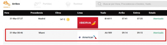 El vuelo AA 989 de la aerolínea América Airlines se encuentra demorado, ya que estaba previsto su llegada media hora antes.