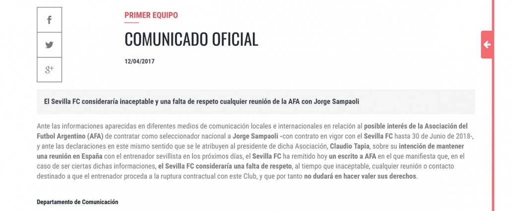 En un comunicado publicado en su página web oficial, el Sevilla FC informó que "ante las informaciones aparecidas en diferentes medios de comunicación locales e internacionales en relación al posible interés de la Asociación de Fútbol Argentino (AFA) de contratar como seleccionado nacional a Jorge Sampaoli" y ante los rumores de posibles reuniones, se remitió un escrito a la AFA donde se manifiesta la molestia del club.