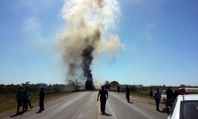 El siniestro se produjo en el kilómetro 193 de la Ruta 5, cuando por causas que se tratan de establecer el conductor de la moto cruzó de senda impactando de frente con el camión.