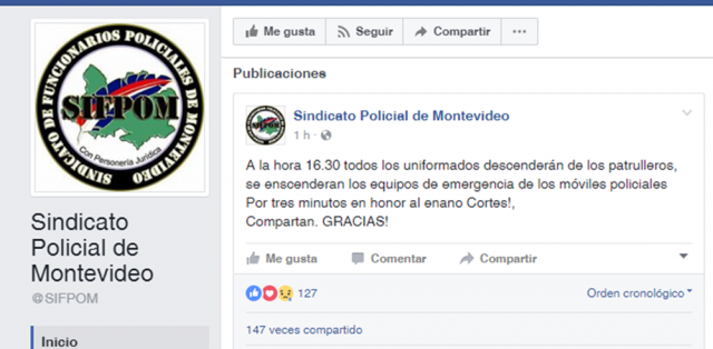 El Sindicato de Policías de Montevideo (SifPom) convocó a todos sus afiliados a rendir "honor" a Roberto Fernando Cortés, efectivo asesinado en la noche de éste miércoles a manos de delincuentes en el barrio Malvín.