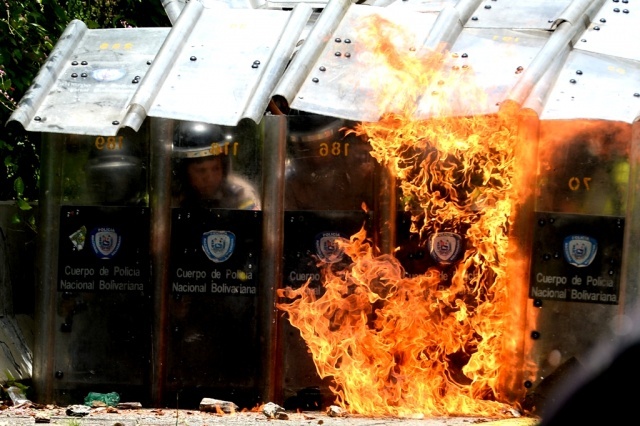 Con escudos improvisados de madera y metal, el rostro oculto con pañuelos, capuchas y máscaras antigases, un grupo de jóvenes, al frente de una multitudinaria manifestación, respondió con piedras, cócteles molotov y de pintura, y algunos incluso lanzando excrementos, en una estratégica vía del este de Caracas.