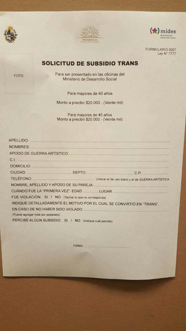 El documento, que hace referencia a una supuesta ley Nº 7777 y se identifica como formulario 0007, realiza preguntas al interesado en acceder al subsidio, como por ejemplo, que indique porqué se convirtió en trans, si fue violado y el apodo de su pareja.