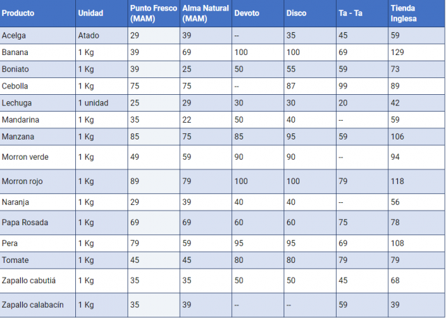 En tanto, en el segundo cuadro se señala el precio promedio por producto para frutas y verduras seleccionados de la Canasta Básica Alimenticia (CBA).