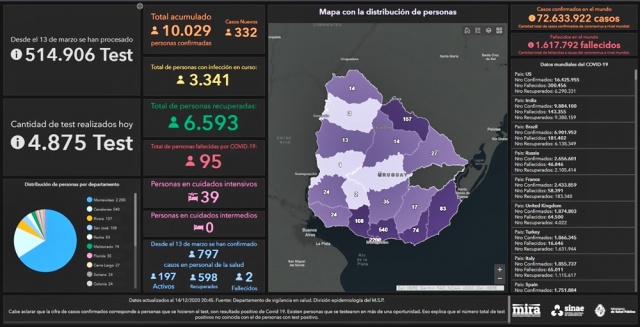 De los 332 casos nuevos, 217 son de Montevideo, 41 de Canelones, 20 de Rivera, 16 de Maldonado, 7 de Colonia, 7 de Paysandú, 7 de Rocha, 5 de Lavalleja, 4 de San José, 3 de Cerro Largo, 3 de Florida y 2 de Artigas.