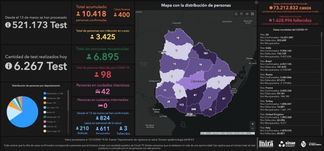 Se detectaron 400 nuevos casos de Coronavirus COVID-19 de acuerdo a la información proporcionada por el Ministerio de Salud Pública (MSP). Hoy se llevaron a cabo 6267 análisis.