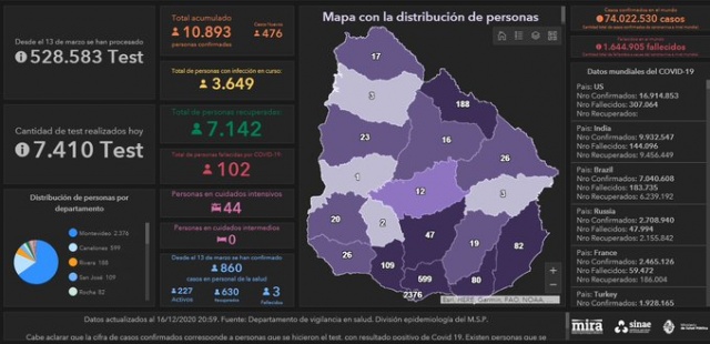 De acuerdo a la información proporcionada por el Ministerio de Salud Pública, se llevaron a cabo 7410 análisis y se detectaron 476 nuevos casos de Coronavirus COVID-19.