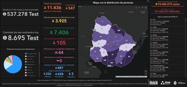 Se detectaron 547 nuevos casos de Coronavirus COVID-19 y se procesaron 8695 análisis, según informó el Ministerio de Salud Pública (MSP).