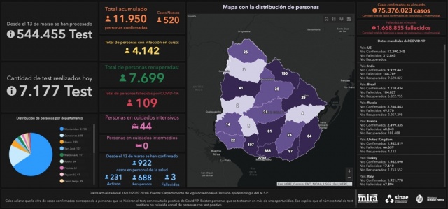 Se detectaron 520 nuevos casos de Coronavirus COVID-19 y se procesaron 7177 análisis, según informó el Ministerio de Salud Pública (MSP).