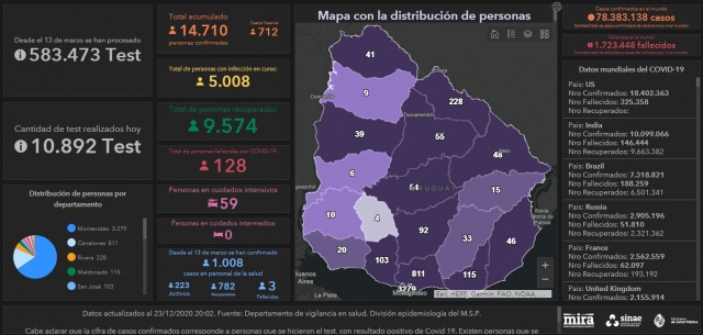 Se detectaron 712 nuevos casos de Coronavirus COVID-19 y se procesaron 10.892 análisis, según informó el Ministerio de Salud Pública (MSP).