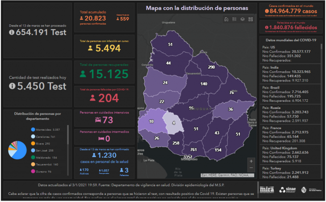 De los 559 casos nuevos, 358 son de Montevideo, 60 de Canelones, 25 de Salto, 22 de Rocha, 20 de Maldonado, 15 de Tacuarembó, 13 de Cerro Largo, 11 de Río Negro, 10 de Artigas, 7 de Florida, 4 de Rivera, 3 de Paysandú, 2 de San José, 2 de Durazno, 2 de Colonia, 2 de Lavalleja, 2 de Treinta y Tres, y uno de Flores.