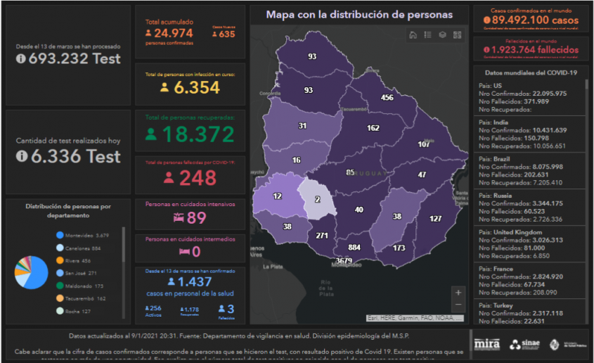 Hasta el momento son 248 las defunciones por COVID-19 en Uruguay. Actualmente hay 6.354 casos activos, es decir personas que están cursando la enfermedad y 89 de ellas se encuentra en cuidados intensivos.