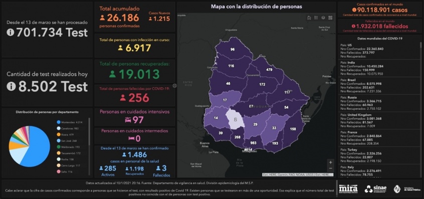 De los 1215 casos nuevos, 772 son de Montevideo, 180 de Canelones, 48 de Rivera, 34 de Maldonado, 31 de Rocha, 24 de Salto, 23 de San José, 19 de Cerro Largo, 18 de Tacuarembó, 17 de Paysandú, 14 de Durazno, 12 de Artigas, 9 de Treinta y Tres, 6 de Colonia, 3 de Soriano, 2 de Florida, 2 de Río Negro y 1 de Lavalleja.