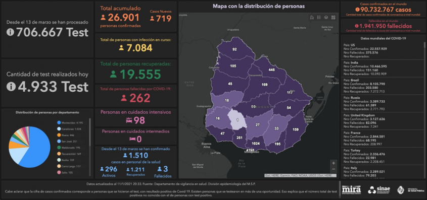 De acuerdo a la información proporcionada por el Ministerio de Salud Pública (MSP), hoy se llevaron a cabo 4.933 análisis y se detectaron 719 nuevos casos de COVID-19.
