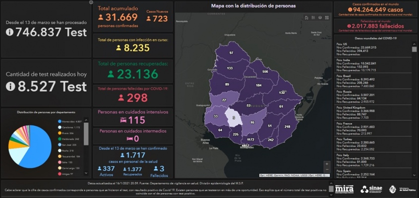 De acuerdo a la información proporcionada por el Ministerio de Salud Pública (MSP), hoy se llevaron a cabo 8.527 análisis y se detectaron 723 nuevos casos de Coronavirus COVID-19.