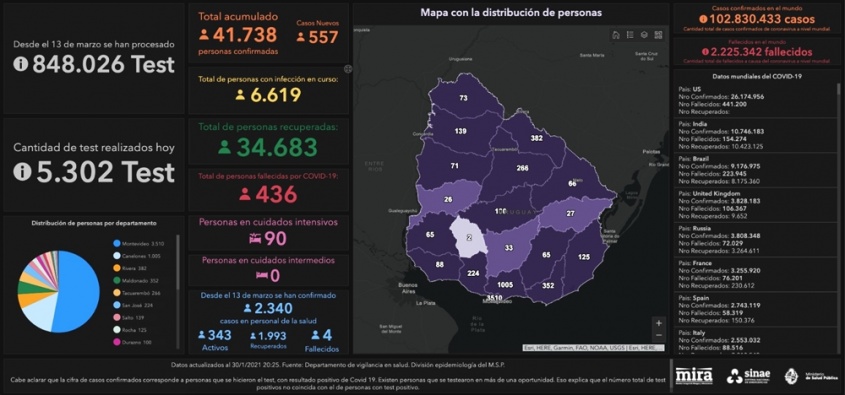 De los 557 casos nuevos, 330 son de Montevideo, 60 de Canelones, 33 de Rivera, 32 de Maldonado, 20 de Tacuarembó, 11 de Paysandú, 10 de Salto, 9 de San José, 8 de Colonia, 7 de Artigas, 7 de Soriano, 5 de Cerro Largo, 5 de Florida, 5 de Rocha, 4 de Durazno, 4 de Lavalleja, 4 de Río Negro y 3 de Treinta y Tres.